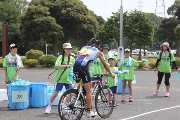 中山農業者トレーニングセンターに開設されたエイドステーションでは、ボランティアらが水をかけ、飲み物、おにぎり、地元産のスイカやメロンで選手の癒しとエネルギーチャージを支えました。(7月20日・撮影)