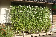 町内でも、ゴーヤ、アサガオ、フウセンカズラなどをグリーンカーテンに仕立てておられる家庭をよく見かけます。写真はユウガオのグリーンカーテン。白い花が優しく、涼しげです。(8月11日・撮影)