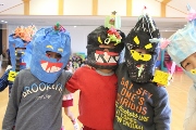 大山きゃらぼく保育園で、節分パーティーが行われました。子どもたちは、空き箱や紙袋で思い思いの鬼のかぶりものを作って遊戯室へ。