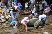親子連れやグループが、日本百名谷の一つとして数えられる甲川で、ヤマメのつかみどりやそうめん流しなどを楽しみました。参加者は流れる水の清らかさと冷たさに驚きながら、楽しい夏の一日を過ごしました。(8月2日・撮影)