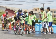 第36回全日本トライアスロン皆生大会が、7月17日に行われました。中山農業者トレーニングセンターに設置されたエイドステーションでは、米子松蔭高校の生徒や大山陸上の小・中学生たちが、飲み物のボトルやスポンジを手渡したり、水をかけたりして選手のサポートに奮闘しました。(7月17日・撮影)
