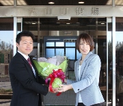 大山町長選で当選となった竹口大紀町長が、4月24日に初登庁。本庁舎前で職員の出迎えを受け、花束が手渡されました。(4月24日・撮影)