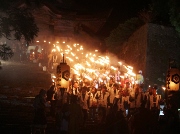 大山開山1300年祭を記念して「秋のたいまつ行列」が行われました。大神山神社奥宮から博労座までを幻想的な炎の河が揺らめきました。博労座特設会場では、大山僧兵太鼓、三徳山行者太鼓が披露され、行列を迎えました。(11月11日撮影)