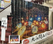 名和中学校の生徒たちが、学校文化祭のために制作したモザイクアート。斜め左からなら、大山寺大献灯の「和傘灯り」、斜め右から見れば「中学校体育祭」の様子が浮かびあがります。