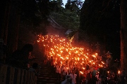 夏山登山の安全を祈願する、大山夏山開き祭が行われました。前夜祭のクライマックスは2000本のたいまつ行列。大神山神社奥宮での神事のあと、博労座へ向かって参道を炎の帯が揺らめきます。(6月2日・撮影)