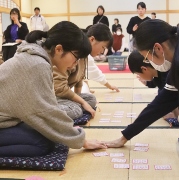 大山町教育委員会主催の「五色百人一首大会」を12月8日に開催しました。今年も競技カルタに取り組んでいる高校生と大学生の皆さんのご協力のもと、3人一組の団体戦で予選、決勝を行いました。